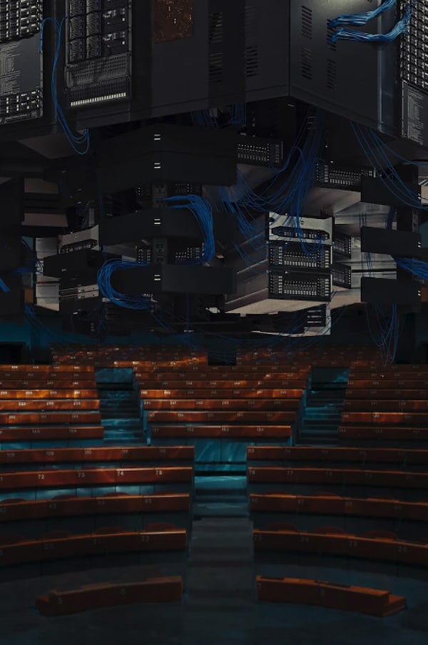 In the wake of a storage crisis that has seen the erasure of digital memory from personal devices, reception works in a former parliament hemicycle that has been repurposed as a data center. She receives a transmission of a woman's intimate memory. The woman speaks in Irish Gaelic and reception interprets her experience into French, faithfully dictating to a machine that transcribes it to history in English. In this vigorous process of receiving and transitioning the woman's memory, reception's own memory escapes her and goes rogue in the showspace. In a choreographed screen ballet, the memory moves onto reception's personal storage devices, enforcing the link between what we hold in our bodies and what is kept in the objects we carry with us.