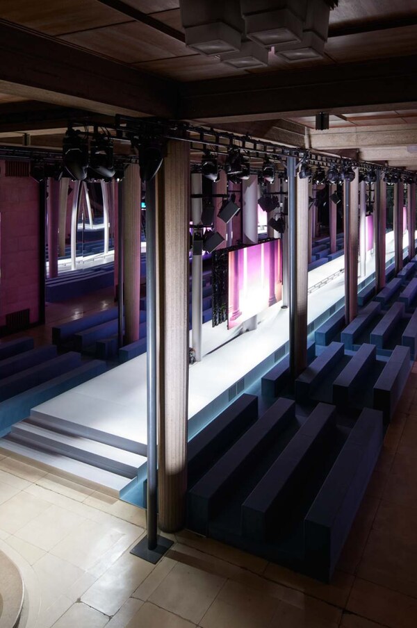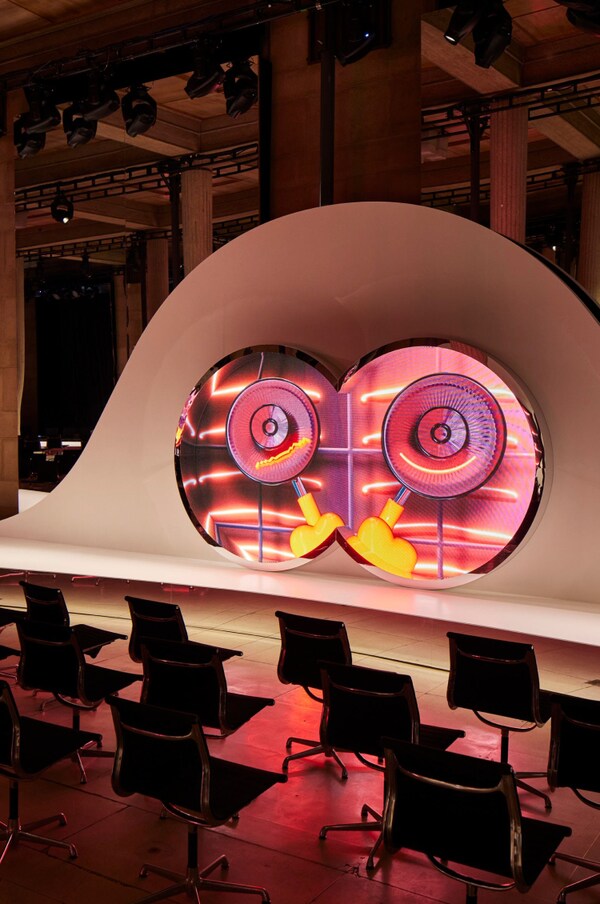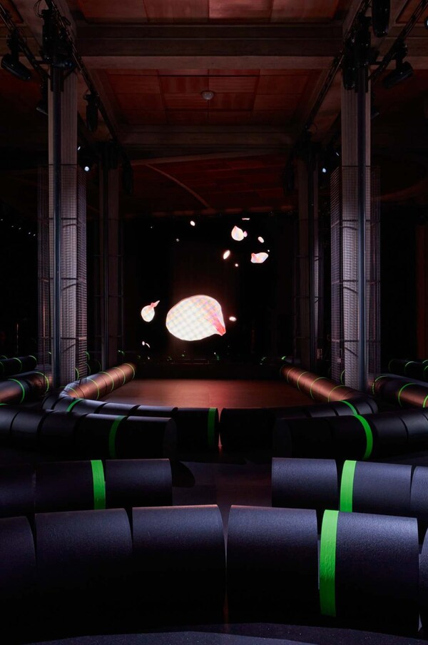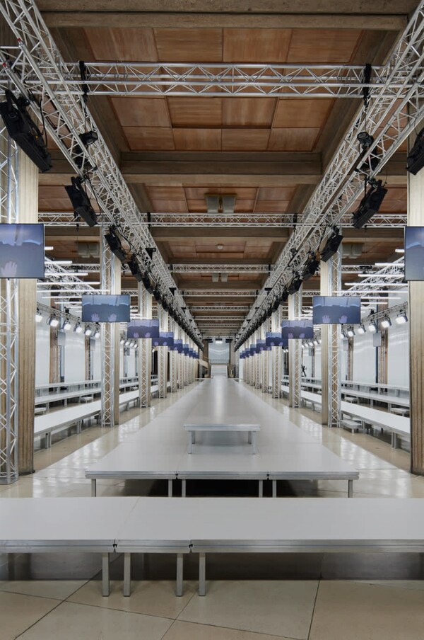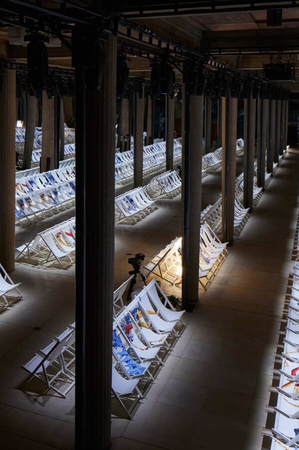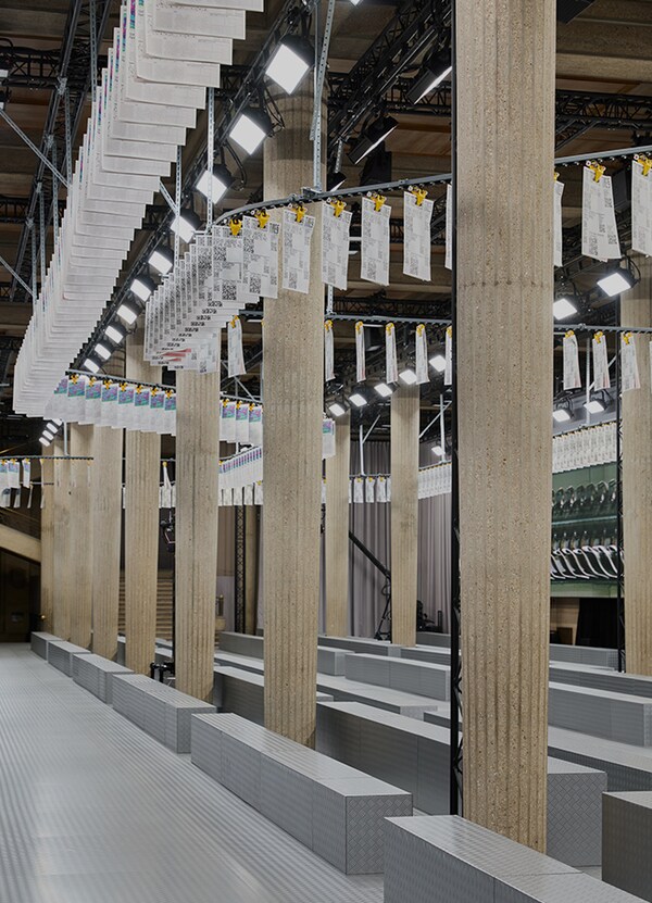 Salt Looks Like Sugar is a multi-layered project developed by Goshka Macuga for Miu Miu SS202s. From the futuristic single-prop newspaper specially edited and designed for the show, titled The Truthless Times, to the overall installation resembling a newspaper printing plant, the artist presents a constellation of elements for deciphering the concept of truth and its representation. Rather than relying on a simple formula, Macuga integrates multiple components into the installation, each guiding the viewer along various paths toward understanding the human experience of reality in today's world where the truth has to be found by individual investigation rather than available in commonly distributed sources. Misconception and aims to communicate are forever entangled. The narrative of the film The Truthless Times follows two characters, Pathos and Logos, who live dual lives as undercover researchers in a newspaper printing plant. Logos, a writer by nature, embodies logic and reason, while Pathos represents emotion. Both work for The Truthless Times, a newspaper funded by the Queer Labour Party (QLP), which was established to promote truth in the media and fight against misinformation. As they navigate the complexities of truth in their work, a personal conflict arises when Logos falls in love with a young philosopher and conceals this from Pathos. The tension between them escalates, leading to an emotional confrontation. The resolution of their conflict is left in the hands of an unseen third presence, Ethos, which exists within the moral consciousness of the audience, subtly guiding their interpretation of events. The history of workers' rights and ideological activism become entangled with personal dilemmas. In the context of the post-truth era, where the boundaries between fact and fiction are increasingly blurred, understanding who controls the narratives related to events becomes even more critical. Issues of truth, misinformation, and manipulation are intricately linked with questions of power, freedom of speech, and representation. The audiences are encouraged to critically reflect on the role of individual investigation and expression in shaping public discourse, and to consider how the freedom to share narratives can be both a tool for empowerment and a site of conflict in the broader struggle over truth and meaning in contemporary society and its future evolution.