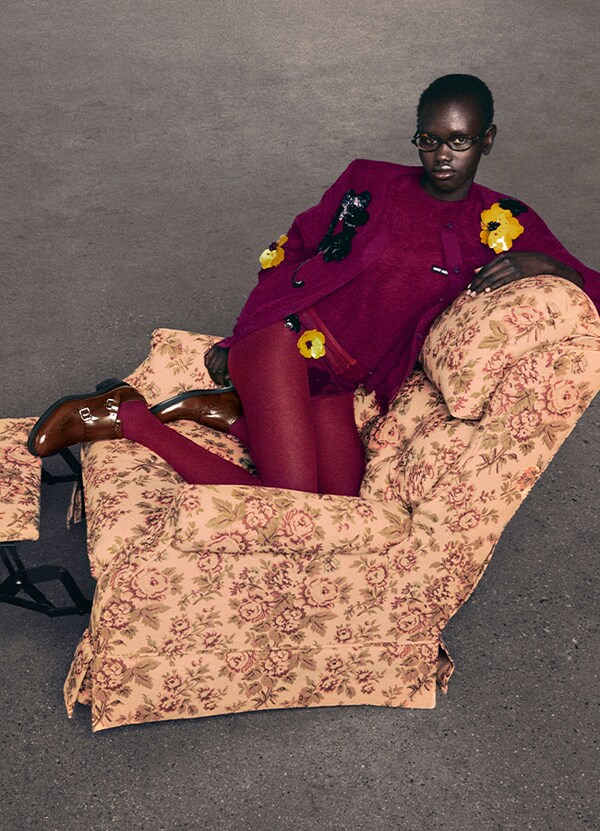 This special launch is celebrated by a still and moving image campaign using a timelessly beautiful gentleman’s armchair, richly upholstered in archive Miu Miu fabric, as a stage. Multiple positions and gestures are adopted by models wearing the Miu Miu ready-to-wear Collection with the Church’s X Miu Miu brogue and double monk strap shoes. The comfort of the armchair and languor of the poses are in direct contrast to the polite and conventional perception of the designs.