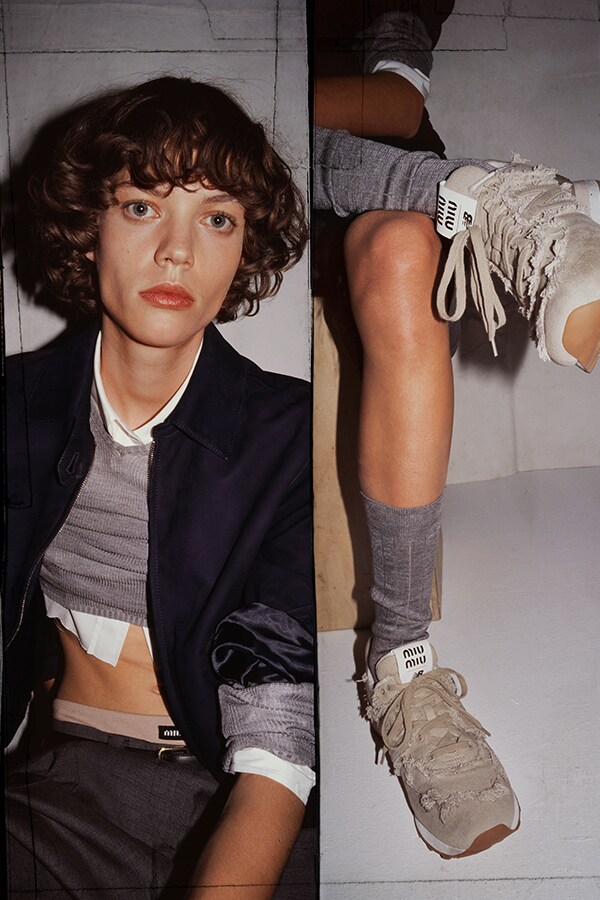 Reflecting the aesthetic codes of Miu Miu, the New Balance 574 is offered in white, khaki, and blue, raw-cut edges emphasising construction through deconstruction. The collaborative model, made in Italy and co-branded on the tongue with stacked New Balance and Miu Miu logos, debuted on the Spring/Summer 2022 Miu Miu runway – where this reinterpretation of the technical athletic shoe, an archetypal wardrobe classic for over 30 years, becomes part of the quintessential Miu Miu vernacular of rebellious luxury.