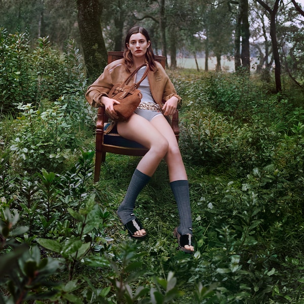 Accessories are similarly light-hearted. Shiny, block-heeled mary janes have a girlish charm. Sneakers with mismatched laces and clogs with authentic wooden heels are soft and eased. The Wander and Beau bags are reiterated in woven leather, the Aventure in natural suede, backpacks, reminiscent of school journeys, in primary-coloured canvas and black and brown leather. Suede crochet appears alongside striped branded beach bags and the preppy Ivy, striped again or in lightweight raffia. Jewellery is inspired by flora and fauna and bag tricks add a finishing personalized touch. Eyewear is oversized, referencing a classic aviator. A leafy garden, dappled sunlight, a breath of fresh air. The familiar is recontextualised to create something new.