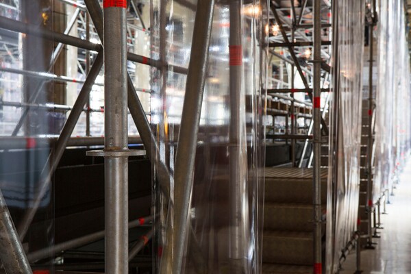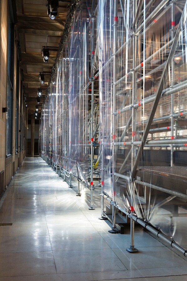 支架与建筑的部分区域均包覆着透明的 PVC 围布,同时地面铺以黑色再生橡胶,巧妙地柔化了设计元素的硬朗风格。